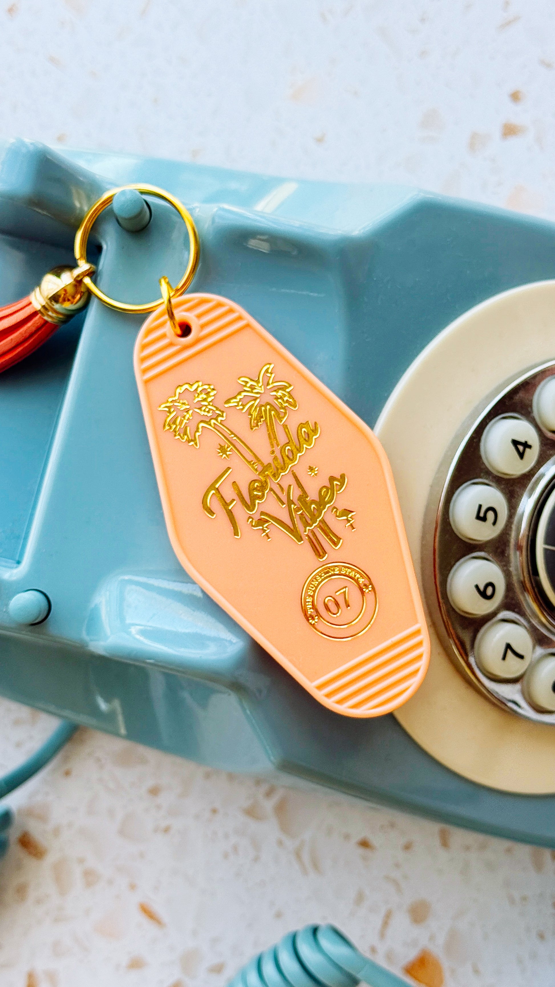 Channel the charm of vintage motels and coastal getaways with our Florida Vibes Retro Key Tag. Designed in a soft peach tone with shiny gold accents, this key tag features a palm-lined “Florida Vibes” design that instantly transports you to warm nights and retro phone calls from a beachside hotel. Numbered "07" and finished with a classic key ring, it’s the perfect nostalgic touch for your keys, bags, or even as a collectible piece from the Florida Vibes Collection.